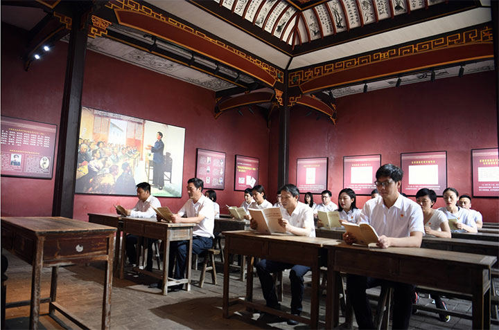 在興國(guó)縣蘇維埃政府所在地——瀲江書(shū)院,毛主席在這里舉辦了興國(guó)縣土地革命干部訓(xùn)練班,為中央蘇區(qū)的土地革命培養(yǎng)了第一批斗爭(zhēng)骨干,建立了興國(guó)縣第一個(gè)革命政權(quán)。大家在土地革命干部訓(xùn)練班舊址學(xué)堂內(nèi),集體誦讀了一段土地革命時(shí)期的歷史,當(dāng)朗朗書(shū)聲再次在書(shū)院響起,珍貴的革命記憶浮于腦海,激勵(lì)黨員們延續(xù)紅色根脈、傳承紅色基因。