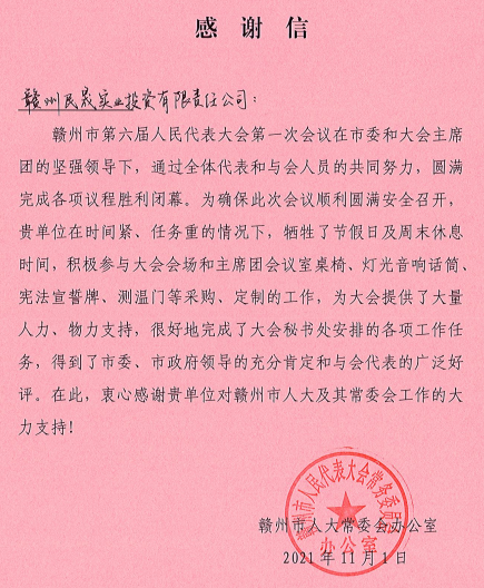 這次圓滿完成市“兩會”會務保障工作,并獲得市人大、市政協(xié)感謝信表揚,是對集團上下講政治、講擔當、講大局的認可與褒獎。第三屆世界贛商大會召開在即,大會開幕式將在贛州大劇院舉辦,民晟實業(yè)公司等相關(guān)單位將再接再厲,熱情服務好各界賓朋,充分展示新時代國企的擔當作為。