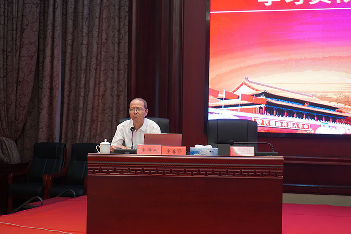 莊春賢以“牢記初心擔(dān)使命,砥礪奮進(jìn)新征程”為題,從“深刻領(lǐng)會習(xí)近平總書記”七一“重要講話的重大意義,切實(shí)把學(xué)習(xí)貫徹講話精神作為一項(xiàng)重大政治任務(wù)抓緊抓好;全面把握習(xí)近平總書記”七一“重要講話的豐富內(nèi)涵,深入理解講話提出的一系列新思想新觀點(diǎn)新論斷;準(zhǔn)確把握習(xí)近平總書記”七一“重要講話的實(shí)踐要求,縱深推進(jìn)新時(shí)代贛南蘇區(qū)振興發(fā)展“三個(gè)方面”,通過引用偉大的革命先驅(qū)為中華民族的偉大復(fù)興而奔走奮斗的英雄事跡,深刻闡釋了偉大建黨精神譜系和以史為鑒、開創(chuàng)未來”九個(gè)必須“的根本要求,對習(xí)近平總書記”七一“重要講話進(jìn)行了系統(tǒng)闡述和重點(diǎn)解讀。